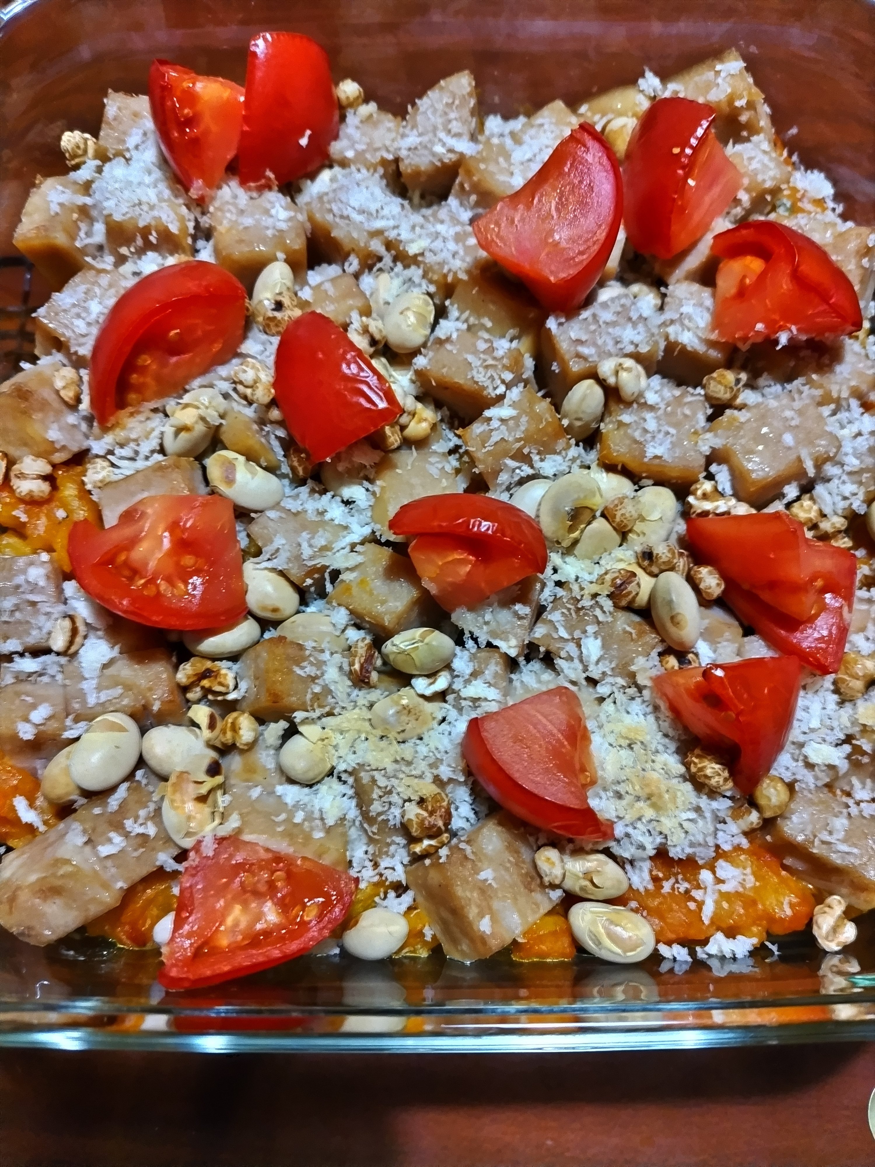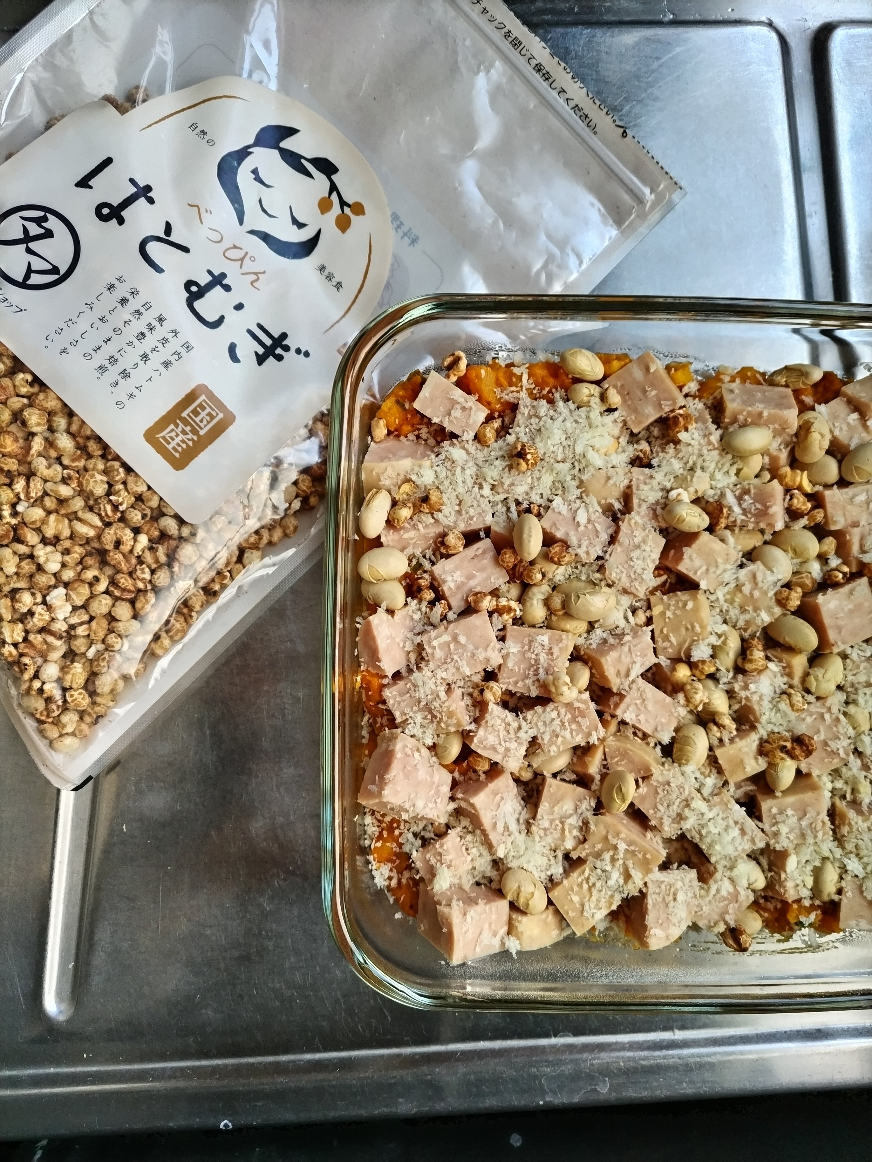 ランチョンミート、トマト、パン粉、入り大豆、ハト麦をトッピングして